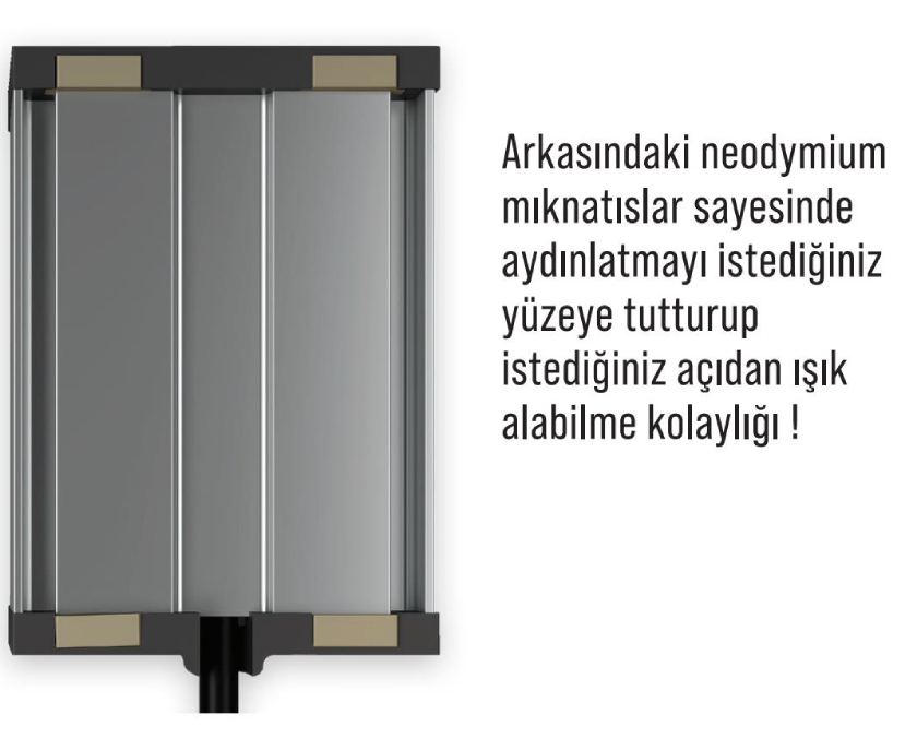Kapak plastikleri alev yürütmez özellikte takviyeli poliamidden üretilmiştir. Cam polikarbonat olup hem güçlü ve dayanıklı karbon bağları sayesinde kırılmaya karşı dirençli ve sağlam olup alev yürütmez özelliğe sahiptir. Gövdesi alüminyum profil olup kolay ısı transferi sayesinde hem aydınlatmanızın ömrünüzü uzatır hem de ortam sıcaklıklarına (-40°C/+50°C) rahat uyum sağlar. Mıknatıslar 1. kalitede N35 olup nikel ile kaplıdır. Diğer mıknatıslara göre çekim gücü daha yüksektir. Ürünümüzü bir güç kaynağından besleyerek acil aydınlatmada da kullanabilirsiniz.