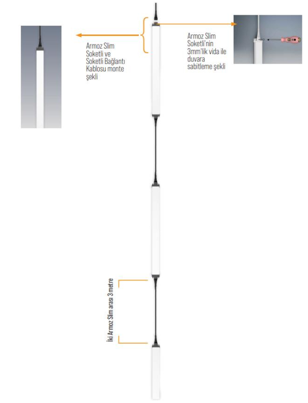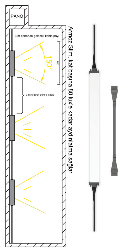 Armoz Slim Soketli’yi soketli kablolarla birbirine ekleyerek kolayca ve güvenli bir şekilde kurabilirsiniz. Armoz Slim Soketli tek başına 150°’lik açı ile 27m³’lük alanda ≥80 lux aydınlatma sağlar.